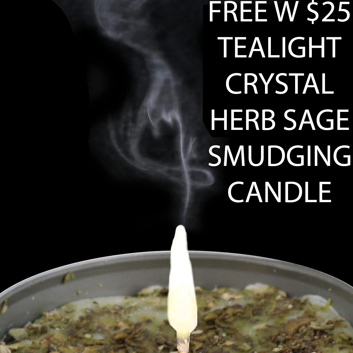 ABOUT THE CANDLE: TEALIGHT SAGE, CRYSTAL AND HERB INFUSED WAX CANDLE BLESSED 500X